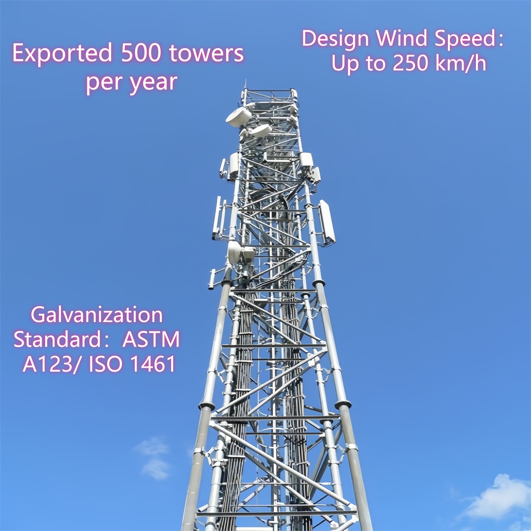 4 legged angular steel tower are based on either ground or building, and they are commonly designed in trusses structure to carry the wind loads and seismic loads. 4 legged angular steel tower is easy to process, transport and install. The overall rigidity of the angle steel tower is large, the bearing capacity is strong, and the technical application is mature.