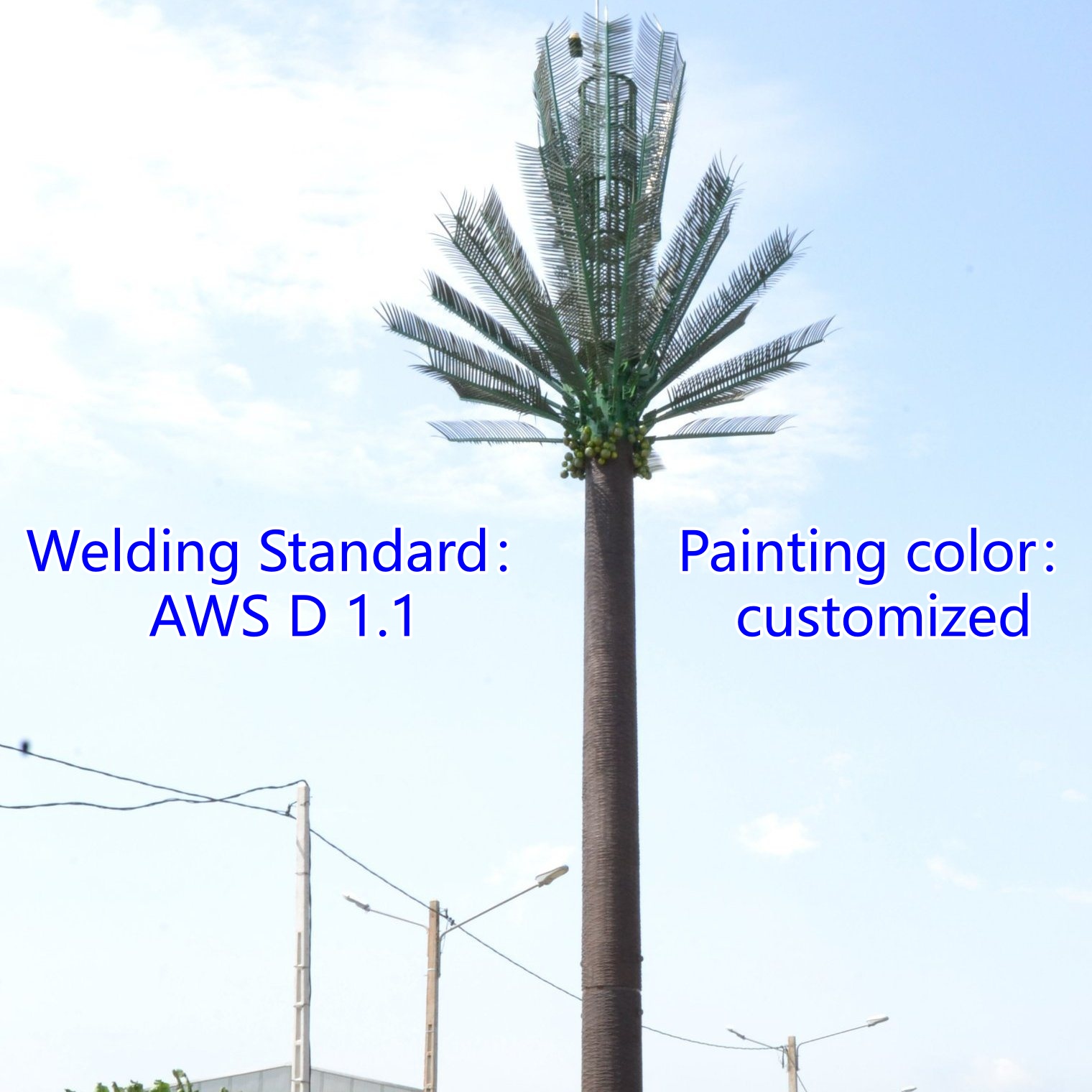 The bionic tree, also known as the bionic tower and the bionic communication tower, belongs to the technical field of communication towers. It is to coordinate the communication tower with the surrounding natural environment, and effectively solve the problem of difficult construction in scenic spots and other places. The advantage is that it maintains all the advantages of the original single-tube tower and makes major breakthroughs and improvements in its shape. Taking natural growth of pine trees, eucalyptus, etc. as simulation samples, designing sketches and computer renderings, formulating sculptures and spraying process procedures, and simulating camouflage of single-tube towers, making people not aware of the existence of towers and integrating them into In the surrounding natural environment.